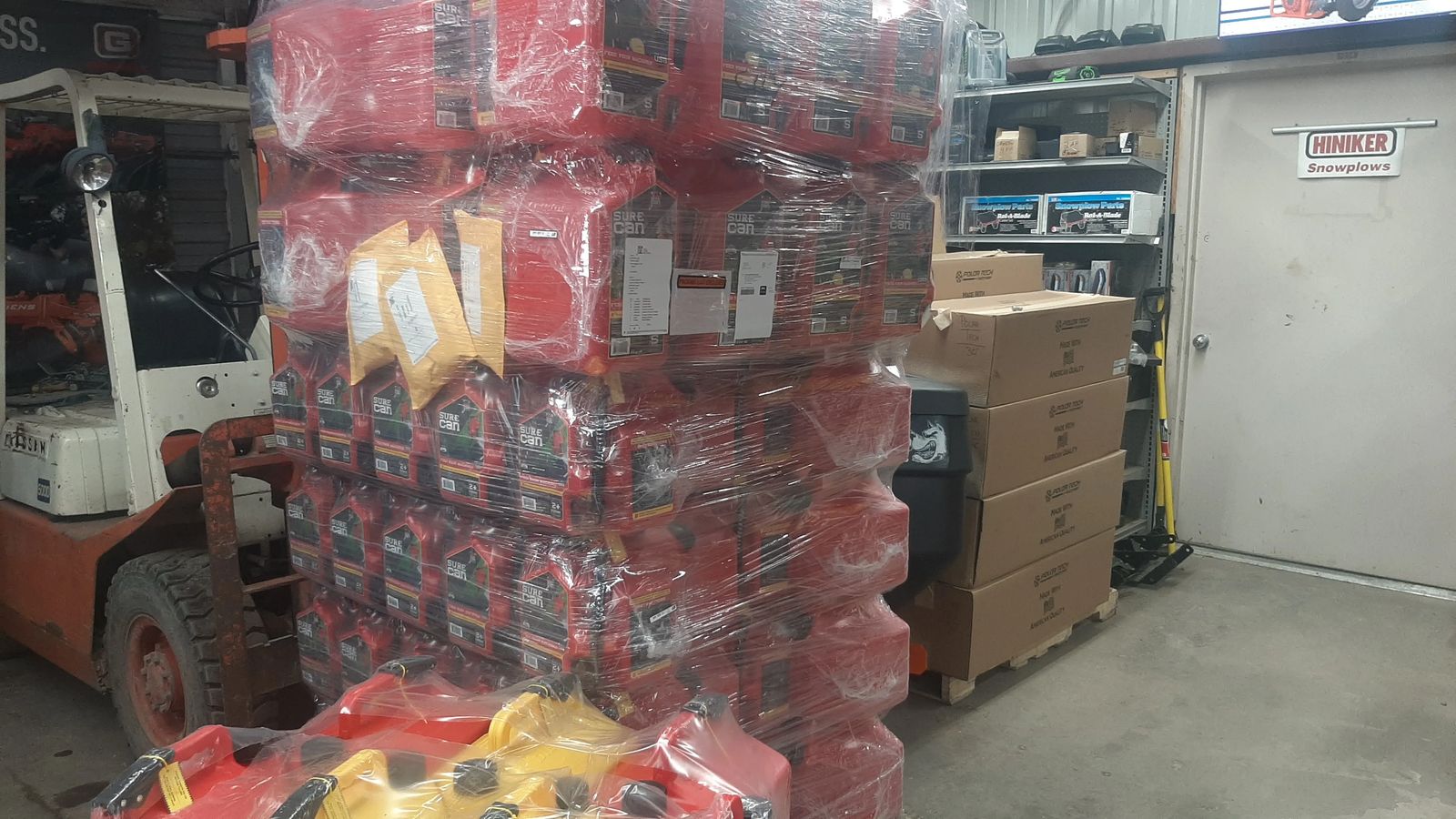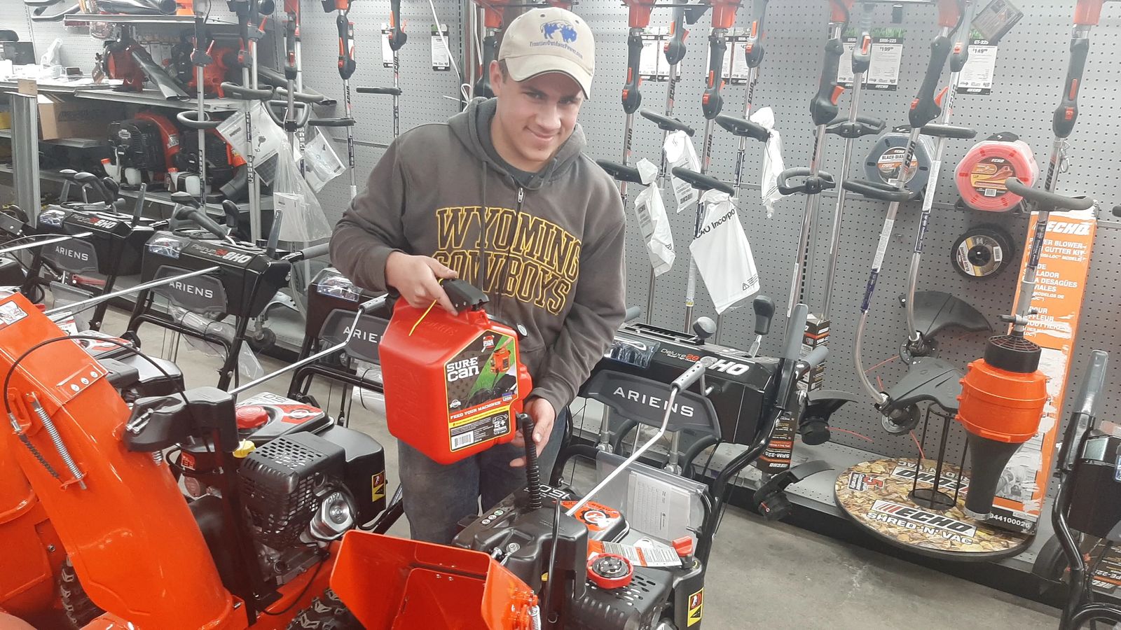 Sales Associate Dustin Smith fuels a new Ariens Snow Blower with ethynol free fuel using a 2.2 gallon SureCan. NO SPILLS!